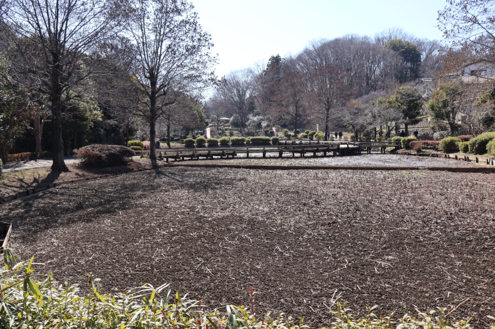 北駐車場から公園に入ると、約2000年前の地層から見つかった実から育成された古代ハス(大賀ハス)の池が迎えてくれます。