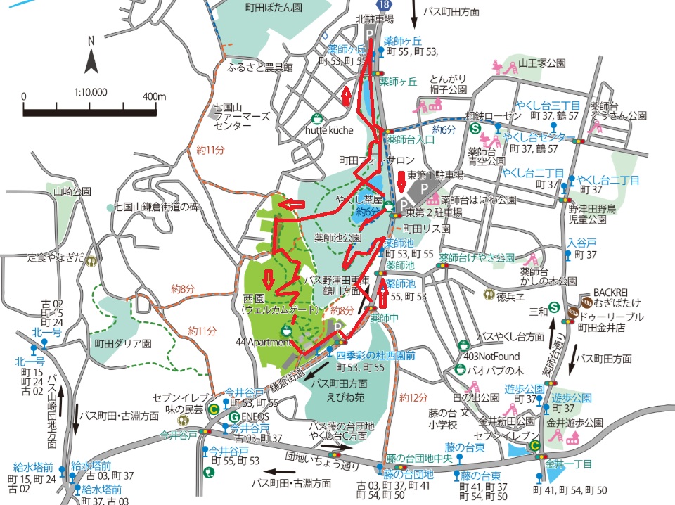 古代ハスの池 ⇒ 薬師池 ⇒ 梅林 ⇒ 薬師堂 ⇒ 西エリア ⇒ 44Aparment ⇒ 薬師池 ⇒ 北駐車場のコースです。