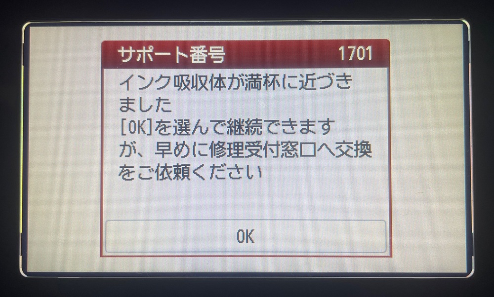 ところが突然「インク吸収体が満杯に近づきました」の警告がでて驚いています。