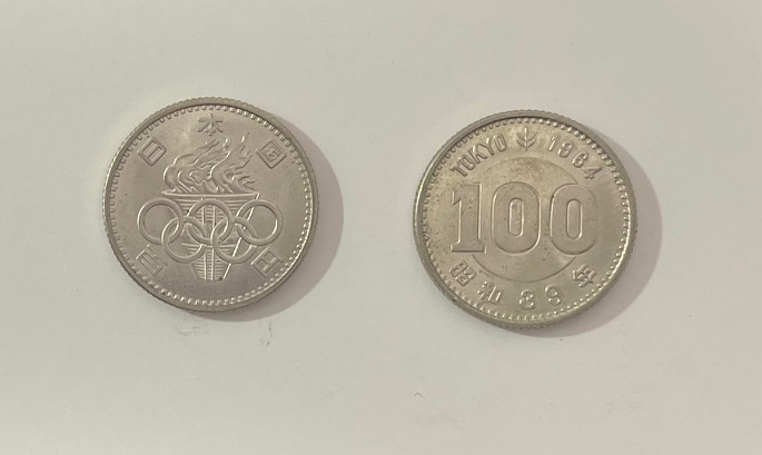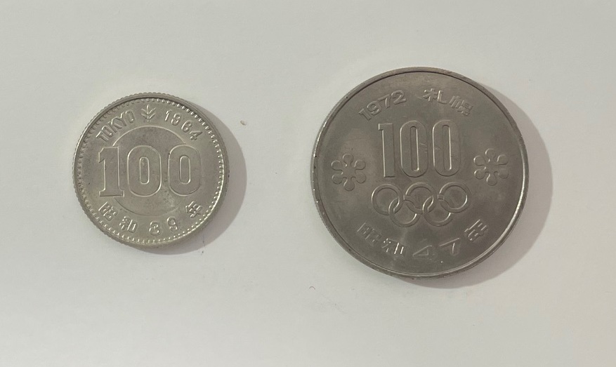 昭和47年の札幌冬季オリンピックの100円硬貨(右)は、とても立派です。