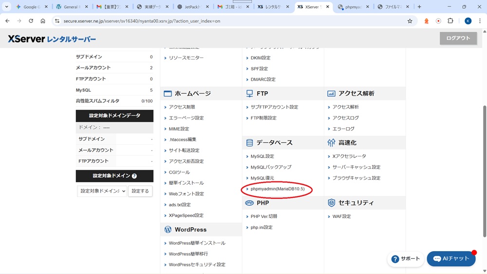 Xサーバー「サーバーパネル」⇒「データベース」⇒「phpMyAdmin」 に入ります。