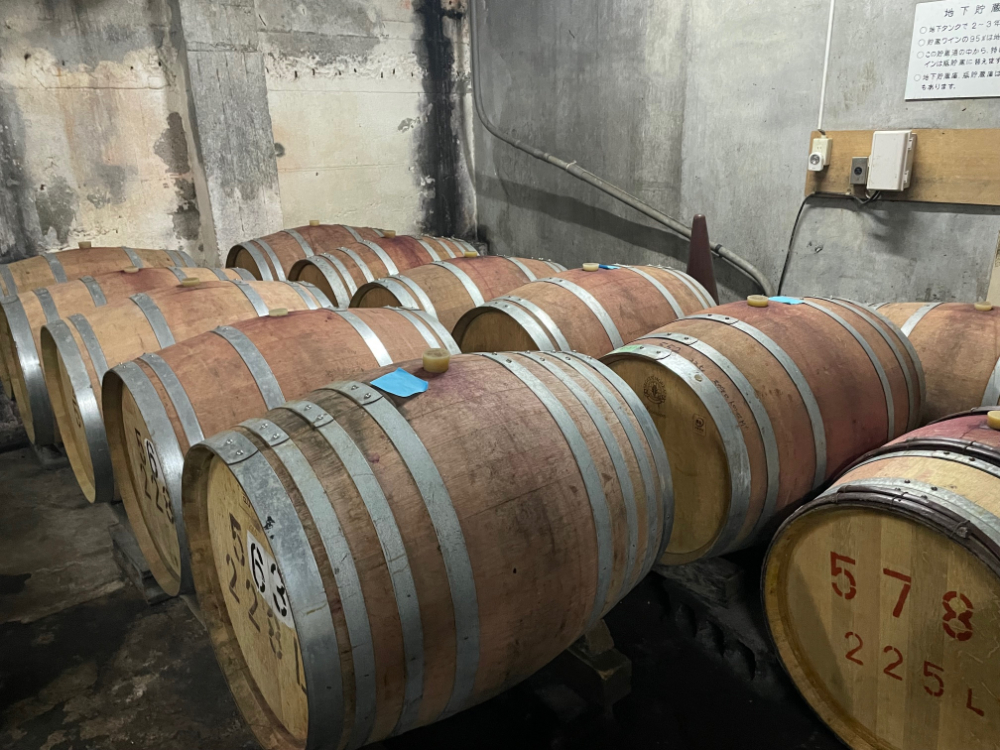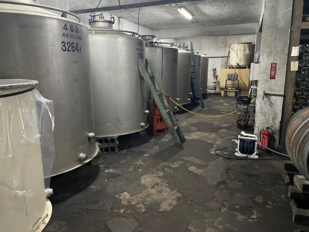 地下の貯蔵では、コンクリート地下タンク、ステンレスタンク、オーク樽、瓶で貯蔵しますが、それぞれの目的で貯蔵容器が変わるとのことです。
