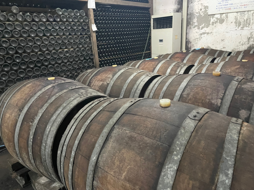 地下の貯蔵庫の奥には、瓶、手前にオーク樽で貯蔵されています。