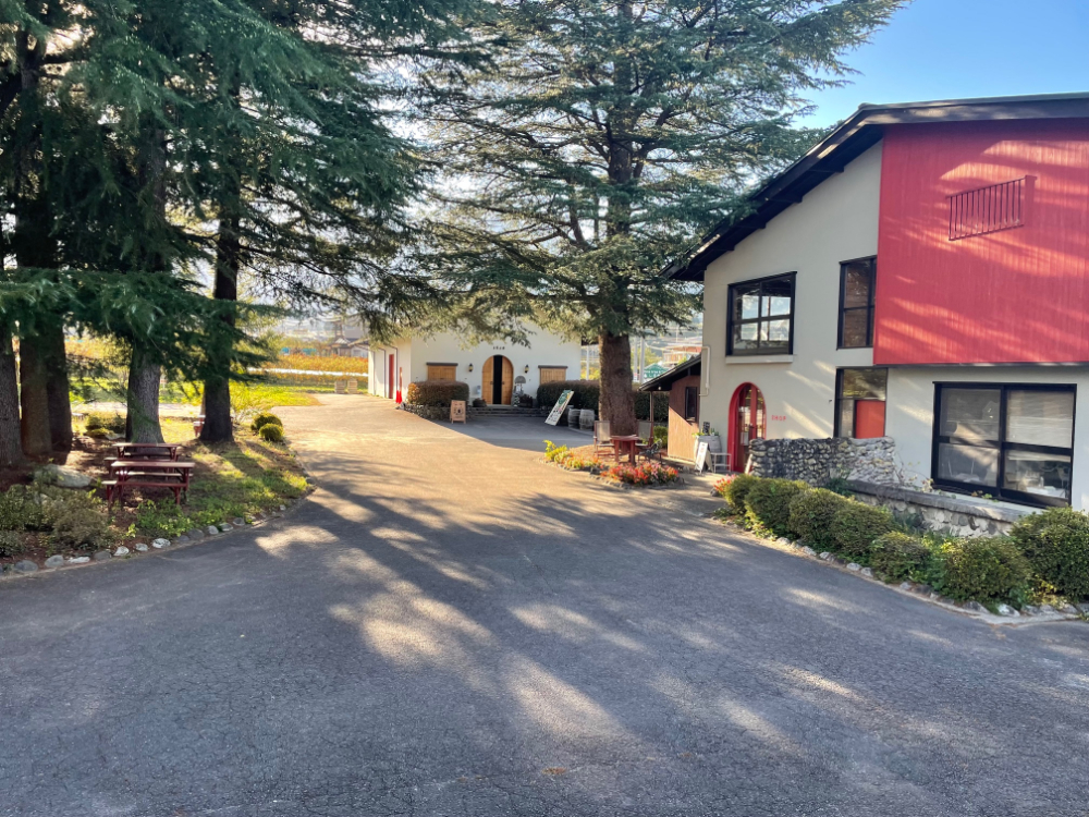 ワイナリーから見た、販売所(右)、甲斐駒ヶ岳資料館(奥)です。