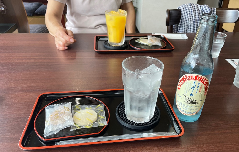喫茶店で有馬サイダーを頼むと、有馬温泉土産の定番の金泉焼がついてきます。