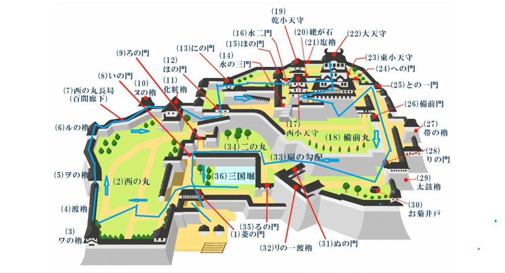 姫路城内は定番のコース(青い線)の桜門 ⇒ 西の丸 ⇒ 百間廊下 ⇒ 大天守 ⇒ お菊井戸 ⇒ 桜門を歩きました。