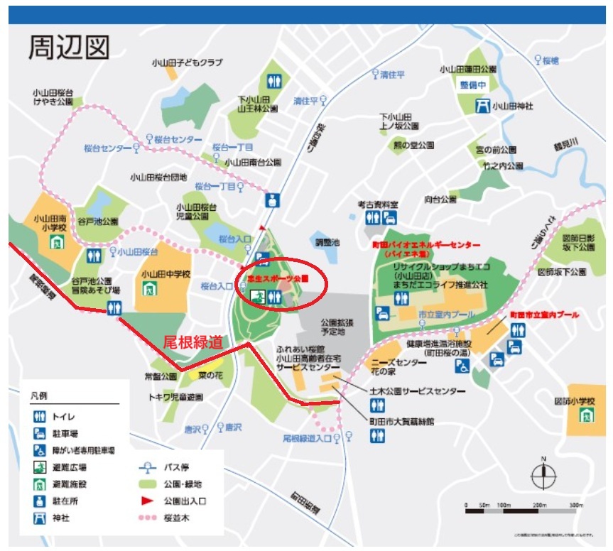 忠生スポーツ公園をベースに尾根緑道を歩くコースは、尾根緑道の東エリアを散策したい人におすすめです。