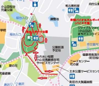 そこでおすすめなのが、忠生スポーツ公園の駐車場に車を停めて、忠生スポーツ公園内と尾根緑道を歩くコースです。