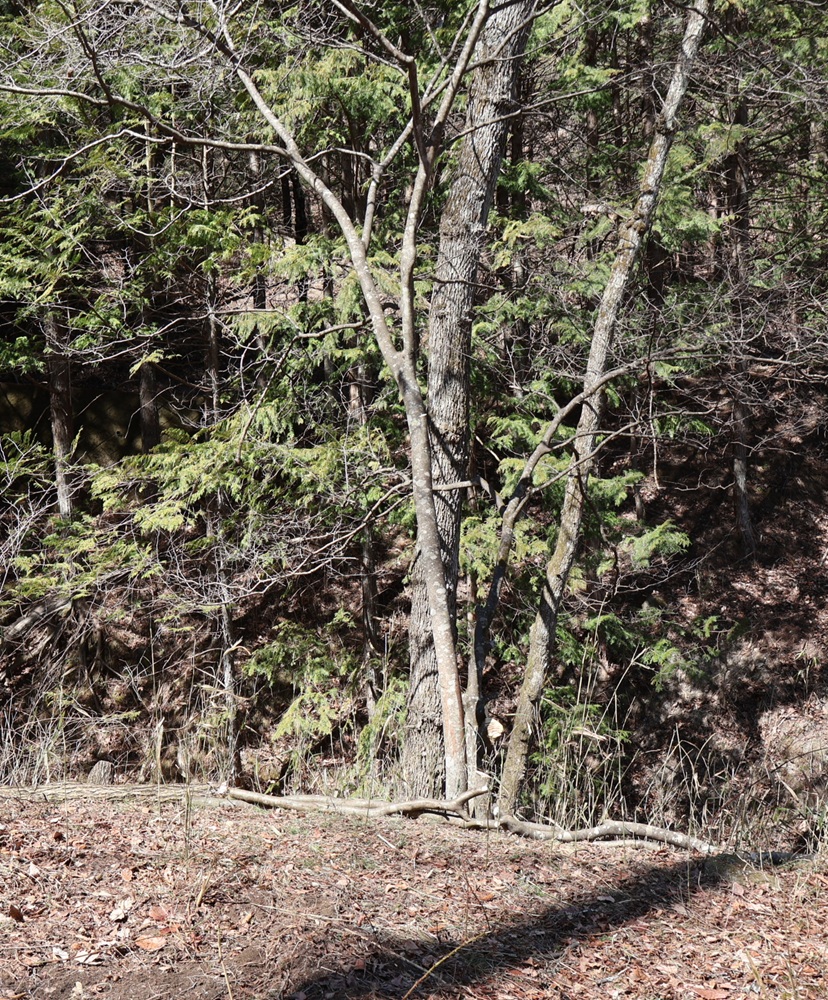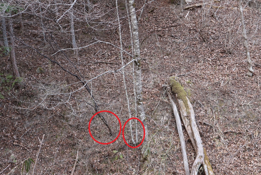 右側の木は自然の倒木です。